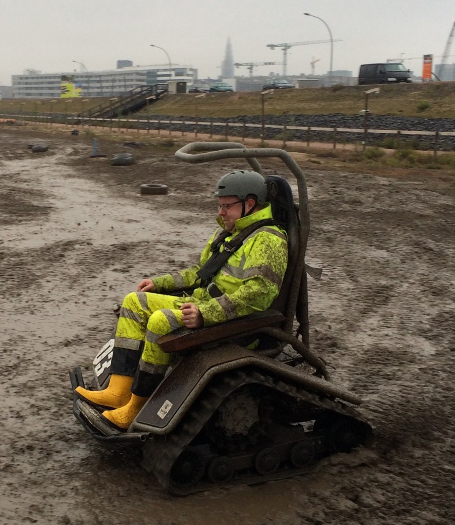 Ohne Schutzbrille und ohne Schnickschnack, aber mit leihweiser gelber Schutzkleidung, ging es auf die Strecke. Die Overalls boten gerade genug Schutz vor dem gröbsten Matsch, ohne den rauen, direkten Charakter des Erlebnisses zu verwässern.