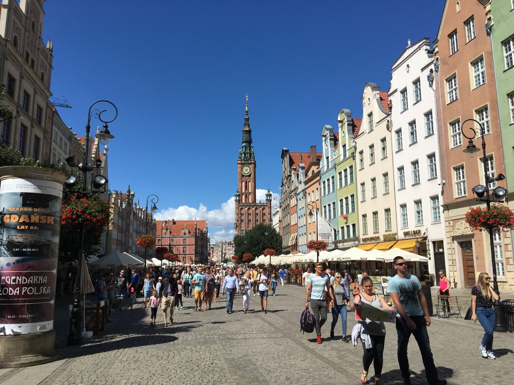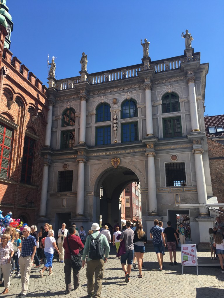 Unser Weg führte uns durch das Goldene Tor (Złota Brama) in die prachtvolle Langgasse (Ulica Długa), die in den Langen Markt (Długi Targ) mündet. Dort reihen sich kunstvoll restaurierte Bürgerhäuser mit farbigen Fassaden und verzierten Giebeln.