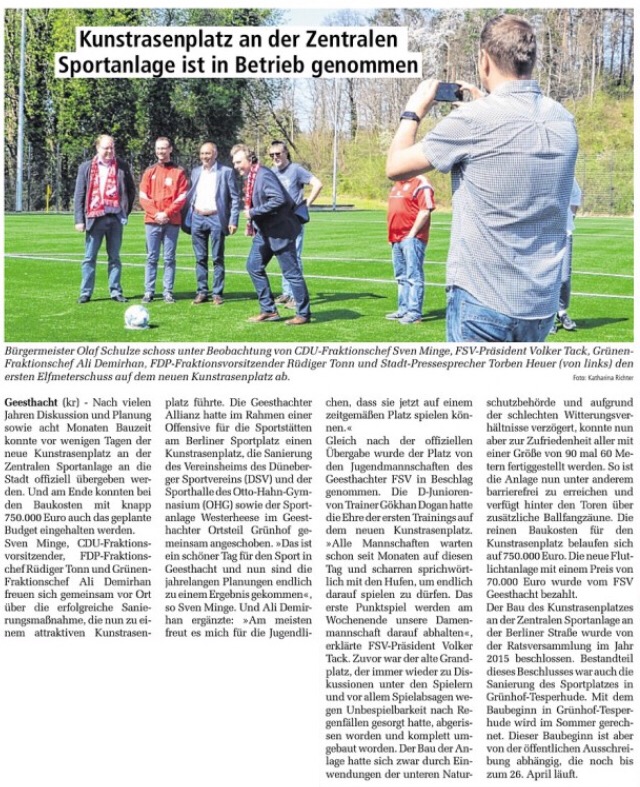 Der Kunstrasenplatz an der Berliner Straße ist heute eine der wichtigsten Sportflächen unserer Stadt. Als ich mich damals kommunalpolitisch und ehrenamtlich engagierte, habe ich – Sven Minge – die Entwicklung dieses Projektes aktiv begleitet und unterstützt. Die Anlage ist inzwischen Heimat des FSV Geesthacht 07 und bietet ganzjährig hervorragende Bedingungen für Training, Spiele und Jugendsport.
