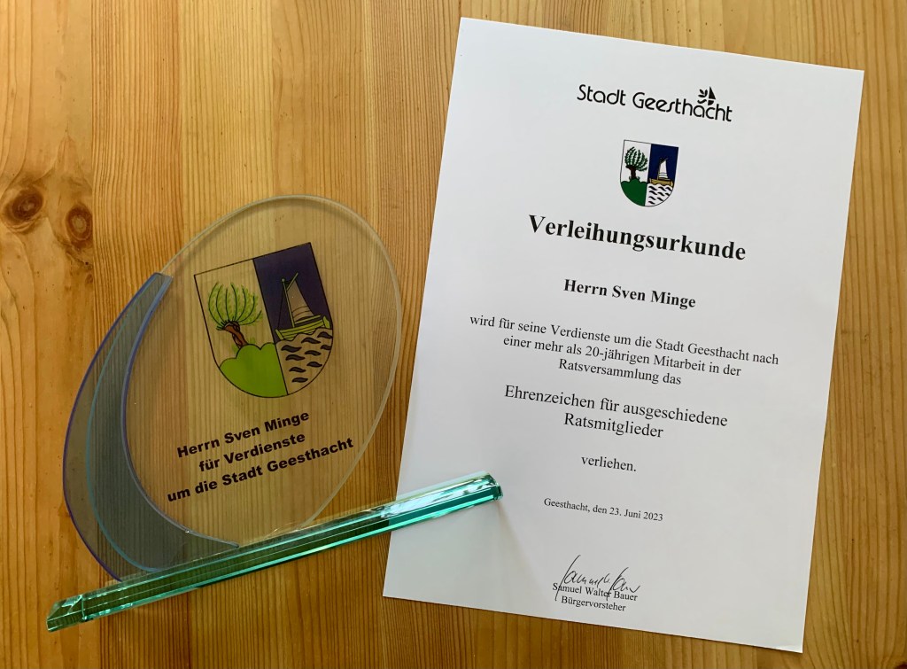 Das Ehrenzeichen der Stadt Geesthacht wurde durch Bürgervorsteher Samuel Bauer ausgestellt. Die Überreichung erfolgte nach der Kommunalwahl durch Arne Ertelt, der die Auszeichnung im Namen der Stadt übergab und die langjährige Ratsarbeit sowie den persönlichen Einsatz von Sven Minge für das Gemeinwohl würdigte. Terminbedingt konnte Bürgermeister Olaf Schulze (SPD) nicht teilnehmen.