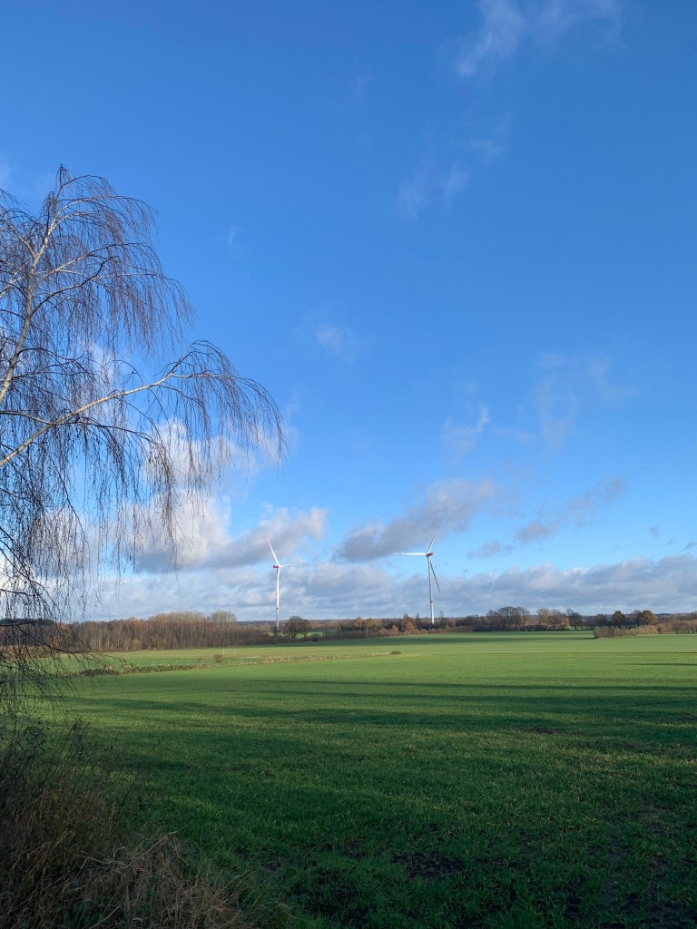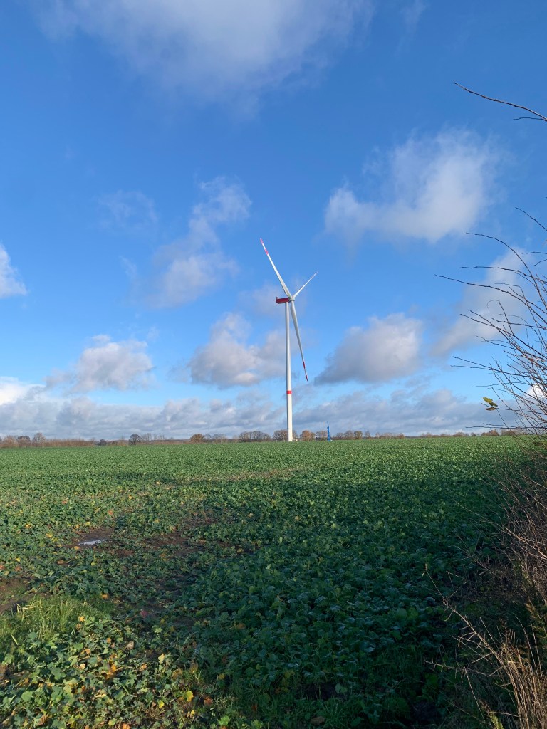 Im Rahmen einer herbstlichen Fahrradtour führte mich der Weg im November 2023 durch die Feldmark bei Hamwarde, wo in den letzten Jahren mehrere neue Windkraftanlagen der neuesten Generation errichtet wurden. Schon aus weiter Entfernung fallen sie ins Auge – sie sind deutlich größer als die bisherigen Anlagen, die man in der Region gewohnt ist.