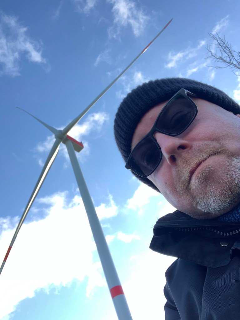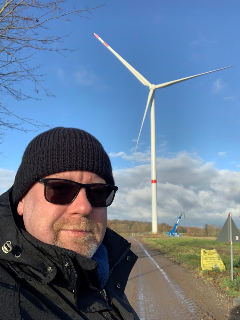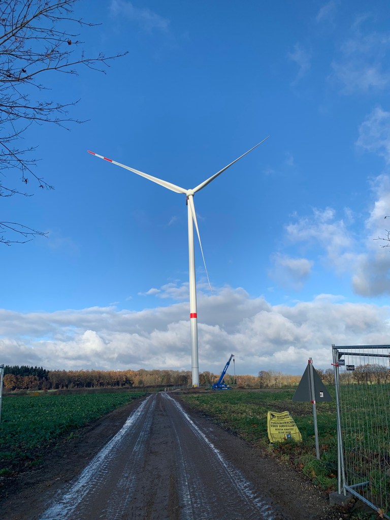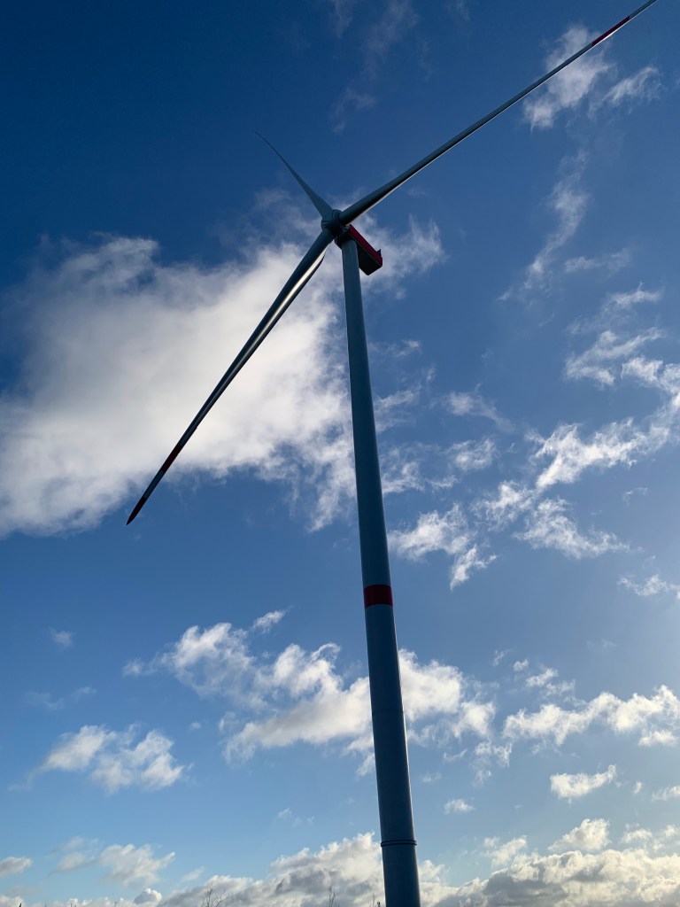 Aus der Nähe wirken die Windräder beeindruckend – beinahe monumental. Die langen Rotorblätter ziehen ruhig, aber kraftvoll ihre Kreise durch den grauen Novemberhimmel. Trotz ihrer Größe ist der Geräuschpegel erstaunlich gering; nur ein gleichmäßiges, tiefes Rauschen ist zu hören, wenn der Wind stärker weht.