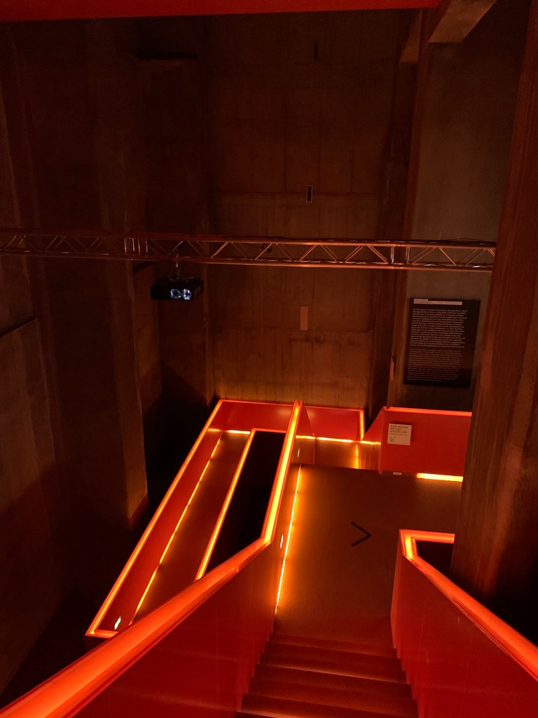 Unser Besuch begann spektakulär: Über die weithin leuchtende, orangefarbene Rolltreppe gelangten wir hinauf in die ehemalige Kohlenwäsche. Der Aufstieg wirkt fast wie eine Inszenierung – mitten im Stahl- und Betongerüst taucht man in ein warmes Licht, das neugierig auf mehr macht. Oben befinden sich heute das Besucherzentrum, ein Café sowie der Zugang zu den Ausstellungen.