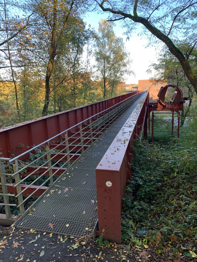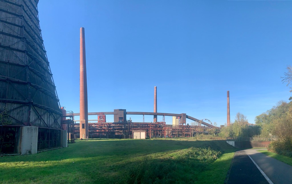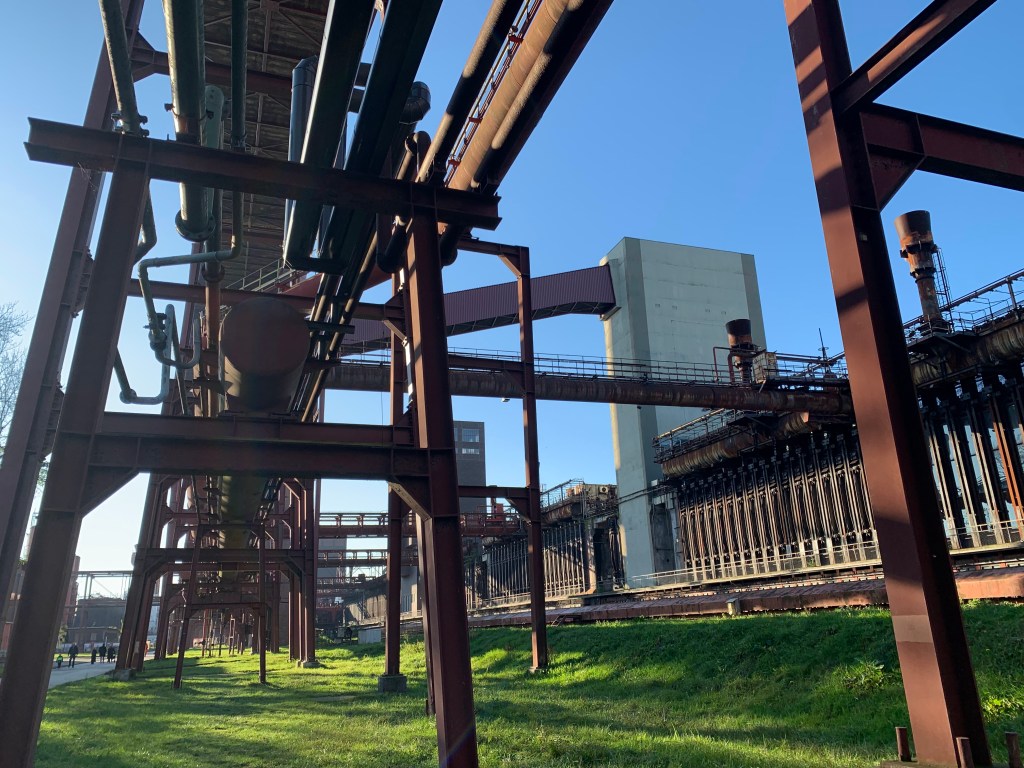 Draußen auf dem weitläufigen Gelände konnten wir die Dimensionen erst richtig erfassen: kilometerlange Bandbrücken, mächtige Hallen und die beeindruckende Kokerei. Diese war einst die größte ihrer Art in Europa und produzierte bis 1993 Koks für die Stahlindustrie. Heute dient sie als Ort für Veranstaltungen, Kulturprojekte und in der Wintersaison als Kulisse für die bekannte Zollverein-Eisbahn. Im November liefen die Vorbereitungen bereits, offiziell öffnet sie jedoch traditionell erst im Dezember.