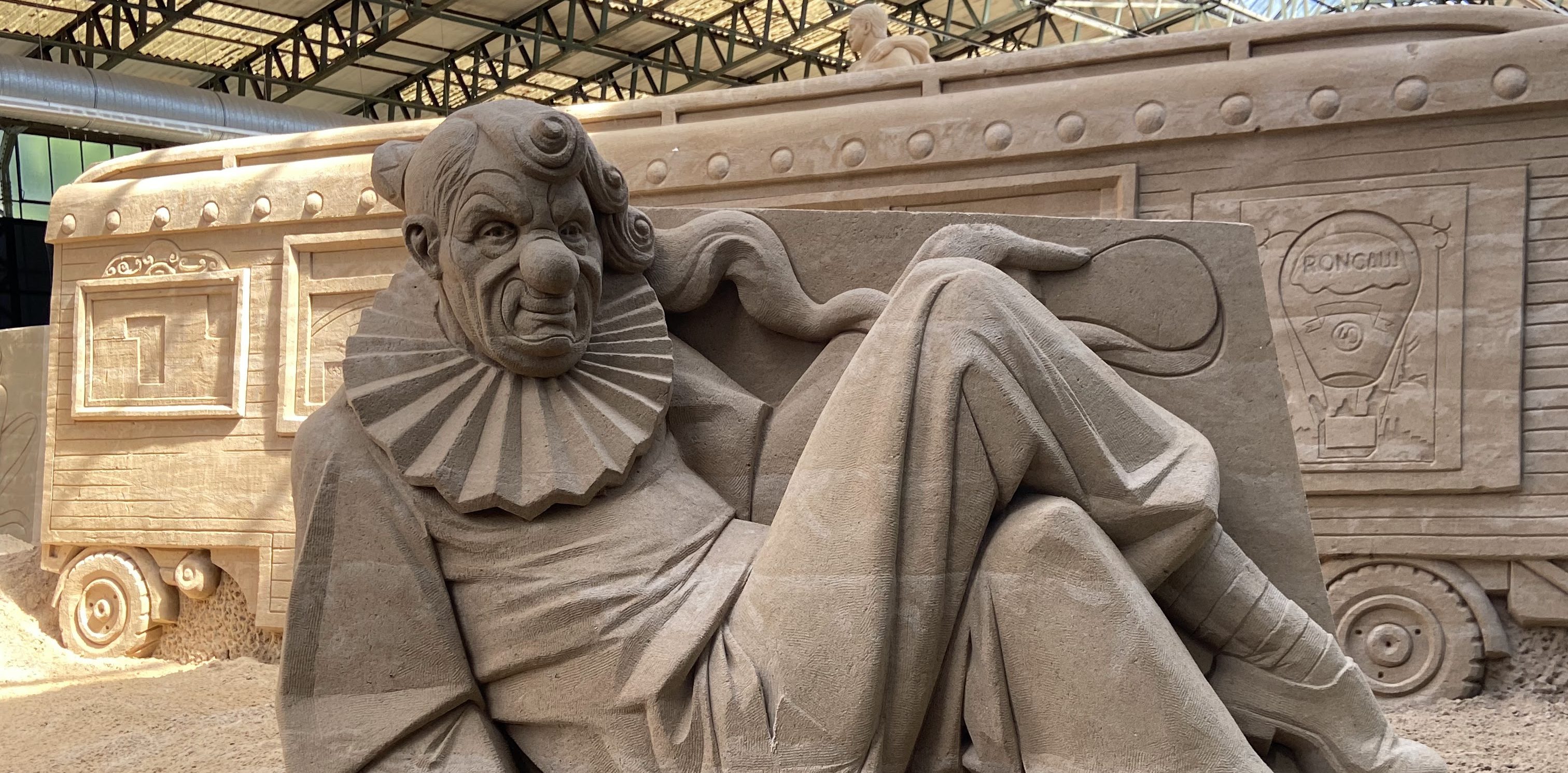 Die bis zu sieben Meter hohen Skulpturen zeigen detailreiche Szenen: Elefanten, die scheinbar gerade trompeten, Clowns mit schelmischem Grinsen, Seiltänzer, die in perfekter Balance über ihre Sandseile schreiten, und nostalgische Zirkuswagen, die an längst vergangene Zeiten erinnern. Sogar berühmte Persönlichkeiten wie Harry Houdini oder Anklänge an den Circus Roncalli finden sich wieder – fein modelliert und mit unglaublicher Präzision gefertigt.