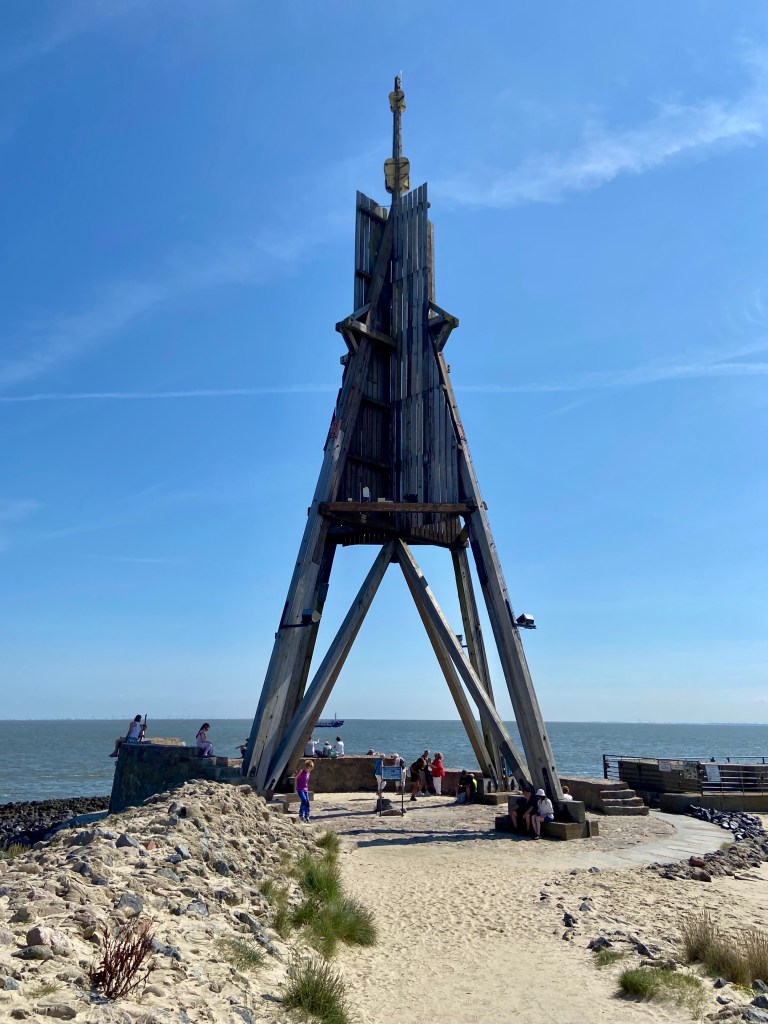Der Spaziergang führte zur Kugelbake, dem hölzernen Seezeichen an der nördlichsten Spitze Niedersachsens. Hier trifft die Elbe auf die Nordsee, und man spürt die Dynamik beider Gewässer. Das dunkle Holzgestell hebt sich markant gegen den Himmel ab – ein traditionelles Landmarke, Fotomotiv und Sinnbild für Cuxhaven zugleich.