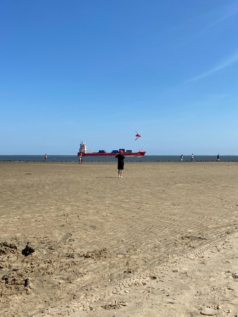 Vom Deich ging es direkt hinunter an den breiten Sandstrand. Das Wechselspiel aus Wattflächen und Wasser prägte die Kulisse – mal glitzernde Priele, mal fest gestampfter Sand, perfekt zum Barfußlaufen. Familien bauten Burgen, Kites flatterten am Himmel, und zwischendurch passierten dickbauchige Frachter auf der Elbfahrrinne.