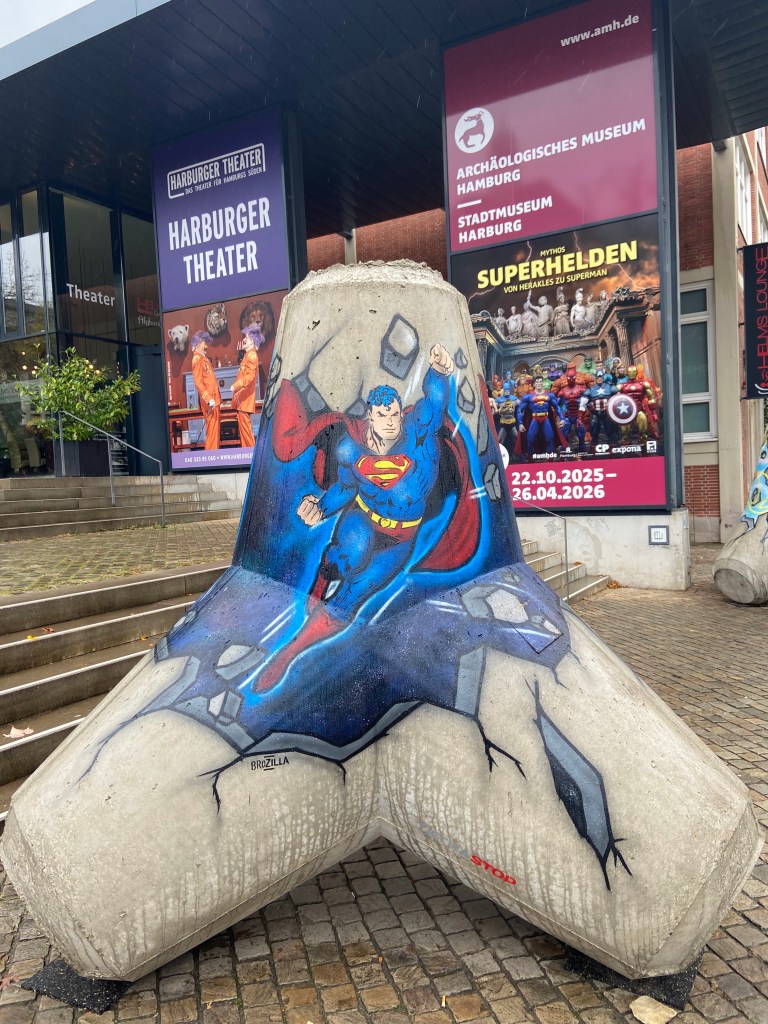 Ein grauer, windiger Oktobertag mit Regenschauern begleitete unseren gemeinsamen Besuch der Sonderausstellung „Mythos Superhelden – Von Herakles zu Superman“ im Archäologischen Museum Hamburg (AMH) in Harburg. Das herbstliche Wetter, das über den Harburger Rathausplatz hinwegzog, bildete einen eindrucksvollen Kontrast zur farbenfrohen, lebendigen Welt, die uns im Inneren des Museums erwartete. Schon beim Betreten des Gebäudes war der Übergang spürbar: draußen Regen und Wind, drinnen Mythen, Götter und moderne Superhelden – eine perfekte Kulisse für eine Reise durch Jahrtausende von Heldengeschichten.