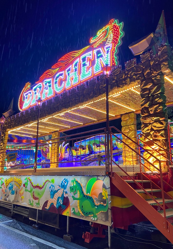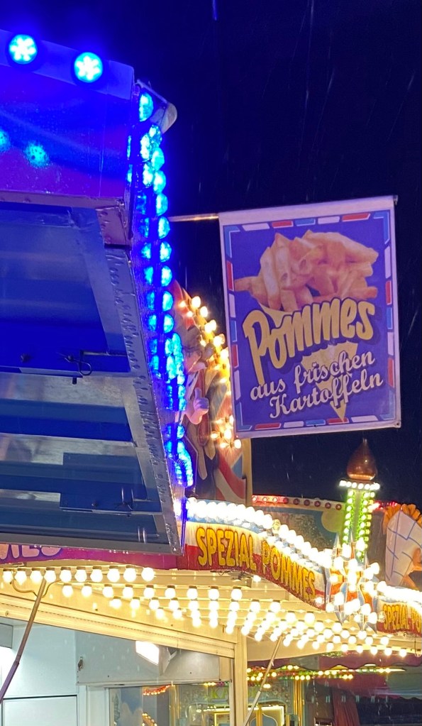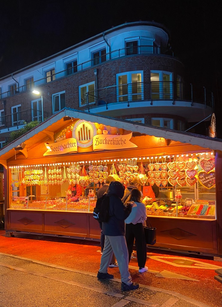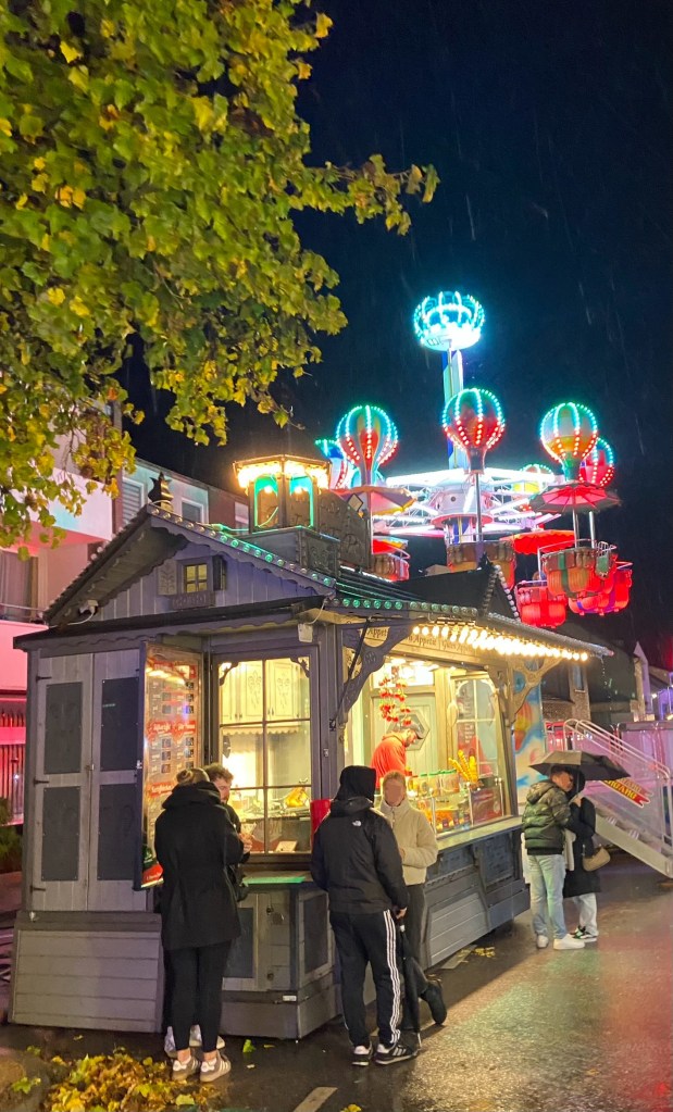 Trotz der eher verhaltenen Besucherzahl herrschte eine gemütliche Stimmung. Die bunten Lichter der Stände spiegelten sich in den nassen Straßen, während der Duft von gebrannten Mandeln, frischen Waffeln und heißem Apfelsaft durch die Luft zog. Besonders verlockend waren die frisch gebackenen Apfel- und Kirschtaschen, die noch warm serviert wurden – außen knusprig, innen fruchtig und süß.