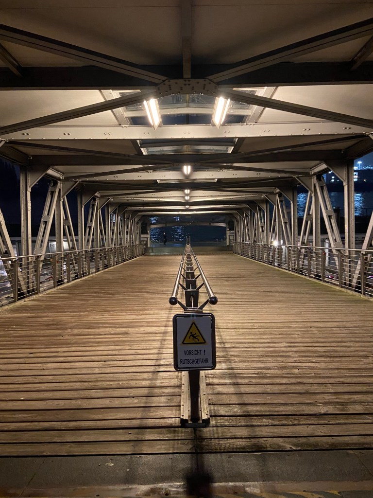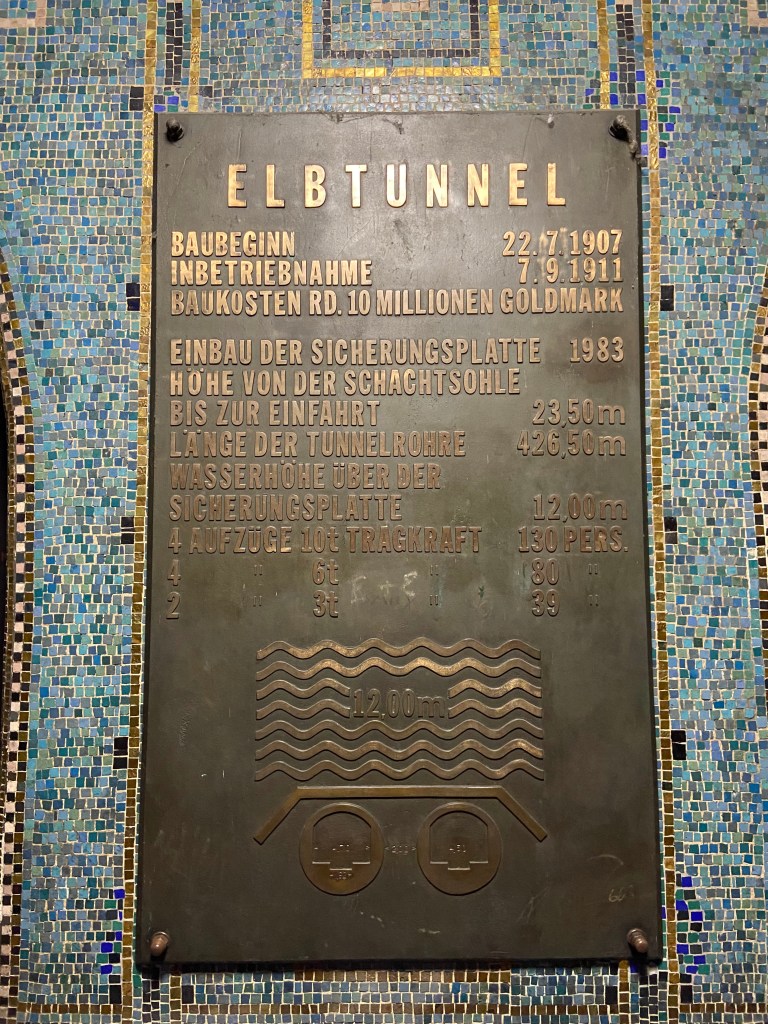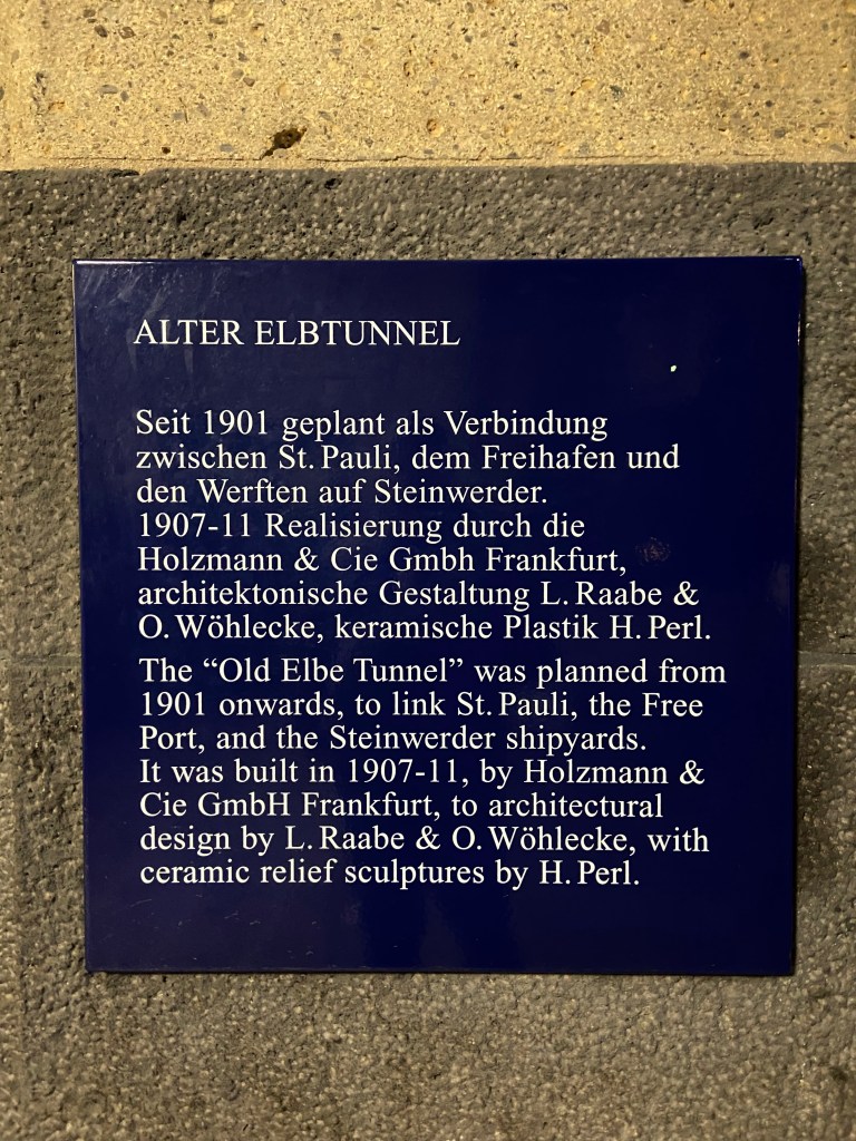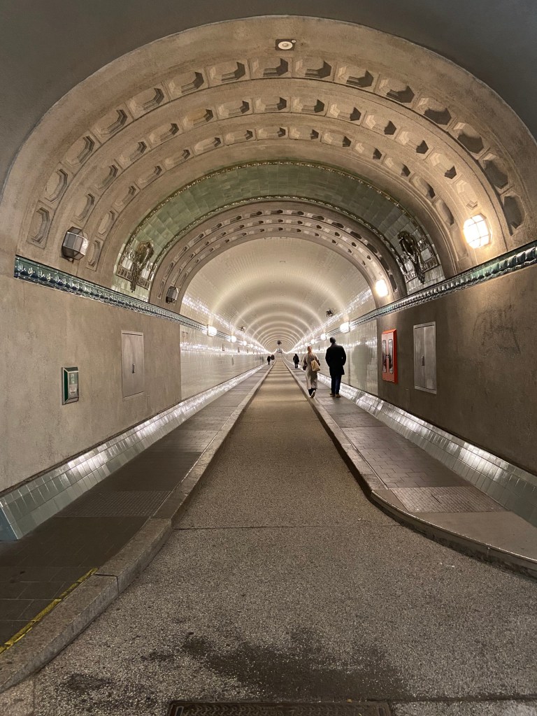 In der Nacht entfaltet der Tunnel eine ganz eigene Stimmung: die gleichmäßigen Lampenreihen, das kühle Echo und die makellos gekachelten Wände mit ihren kunstvollen Reliefs – Darstellungen von Fischen, Muscheln und anderen maritimen Symbolen – erzählen von Hamburgs maritimer Geschichte. Wir begegneten nur wenigen anderen Besuchern, und so blieb Zeit, diesen besonderen Ort in Ruhe auf sich wirken zu lassen.