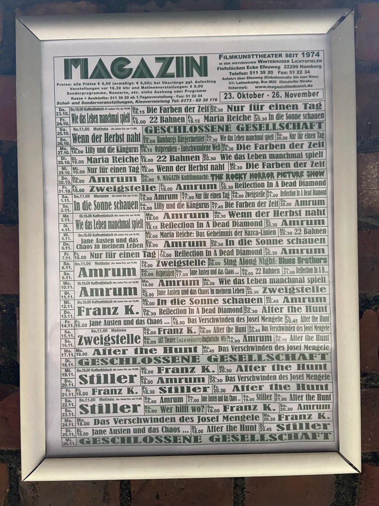 Ein grauer, trüber Novembertag in Hamburg – feiner Nieselregen über den Dächern von Winterhude, das Licht gedämpft, die Straßen glänzen feucht. Ein perfekter Moment, um sich für einige Stunden in eine andere Zeit zu begeben. Gemeinsam besuchten wir das traditionsreiche Magazin Filmkunsttheater in der Straße Fiefstücken 8a – ein Ort, der schon beim Betreten eine besondere Atmosphäre ausstrahlt. Der Duft von Holz, das matte Licht, der samtrote Vorhang: Hier wird Kino noch als kulturelles Erlebnis verstanden, nicht bloß als Unterhaltung.