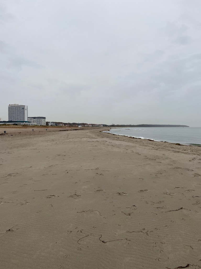 Mit Kapuzen über dem Kopf und den Händen tief in den Taschen liefen wir über die nassen Holzbohlen in Richtung Sand. Die Fußspuren vor uns verwischten im Regen, Möwen kreisten über dem leeren Strand und ihre Rufe mischten sich mit dem gleichmäßigen Rauschen der Wellen. Von sommerlichem Ostsee-Trubel war nichts zu spüren – keine Strandkörbe, keine Badetücher, nur ein paar vereinzelte Spaziergänger mit Hund, die sich dem Wetter ebenso tapfer stellten wie wir. Gerade diese Leere verlieh dem Morgen eine besondere Stimmung: ruhig, reduziert, fast ein bisschen melancholisch, aber sehr ehrlich.