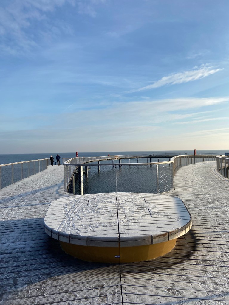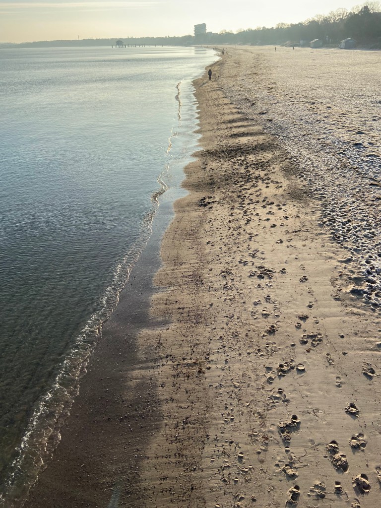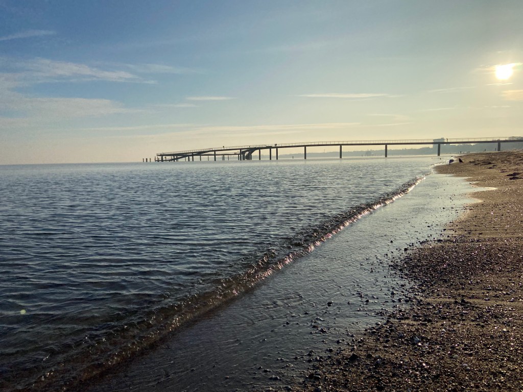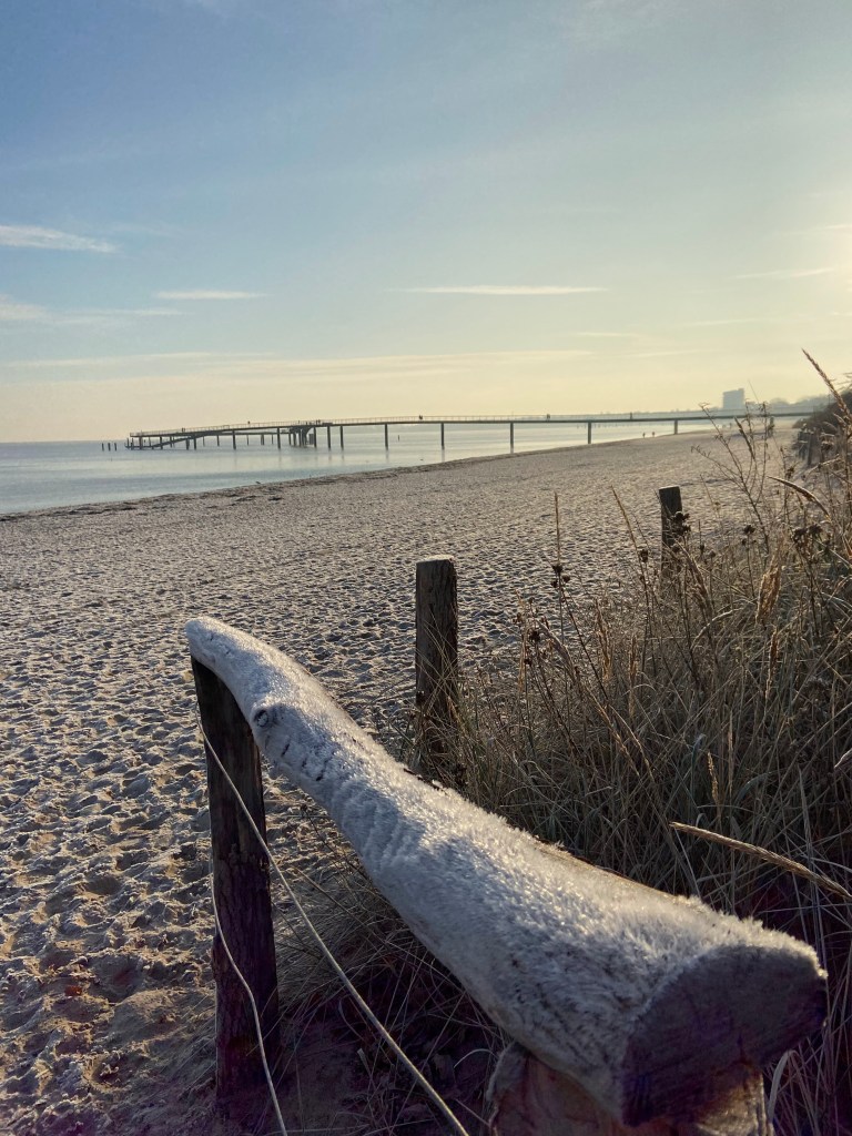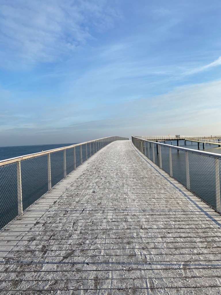 Mit jedem Schritt auf den hölzernen Belag der Brücke wurde es leiser. Der frische, fast frostige Wind, das Rauschen der Wellen und ein paar Möwen begleiteten uns. Die Temperaturen knapp über dem Gefrierpunkt sorgten dafür, dass die Luft besonders klar wirkte, und die Ostsee spiegelte das sanfte Morgenlicht wider.