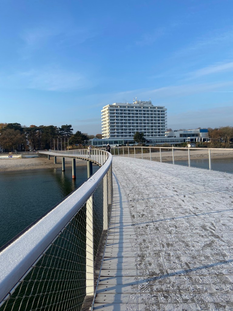 Von der Strandallee aus führte unser Weg zunächst am Maritim Seehotel vorbei, dessen markante Silhouette seit Jahrzehnten zur Küste gehört. Die neue Seebrücke war schon aus der Ferne sichtbar – modern, geschwungen und deutlich eleganter als die frühere Konstruktion.