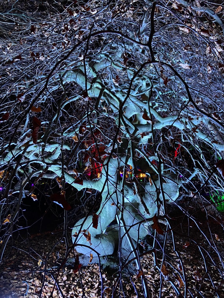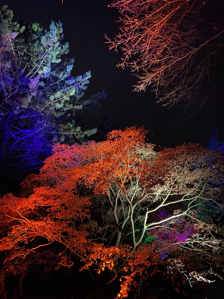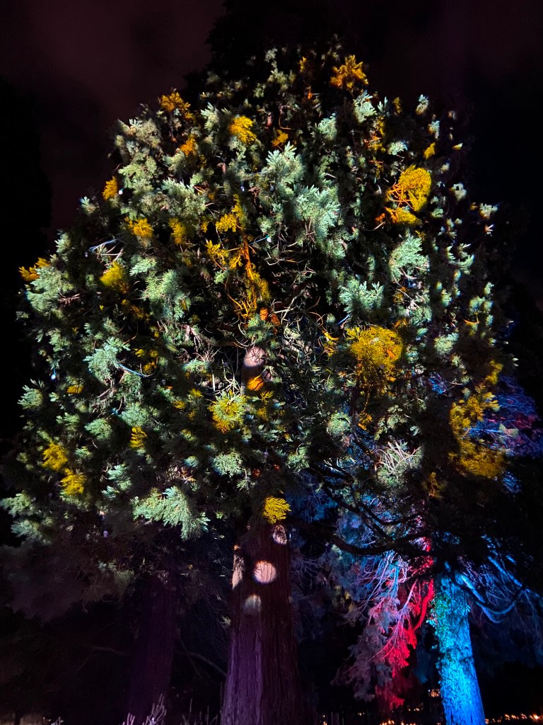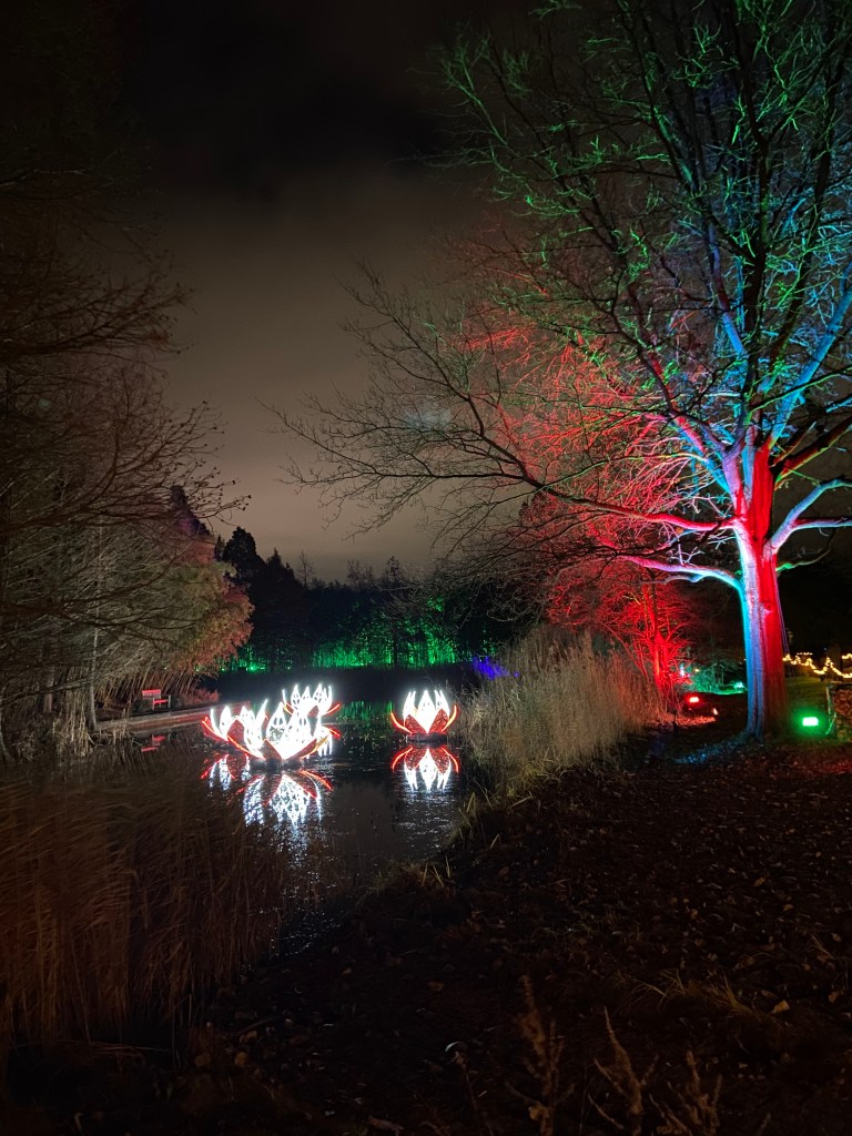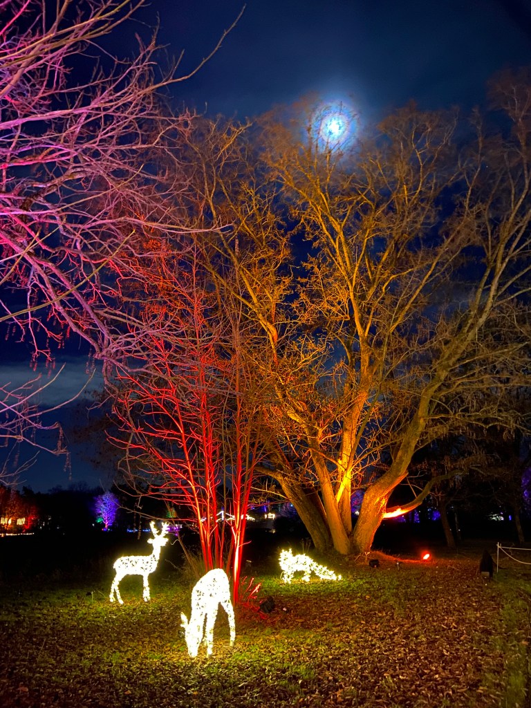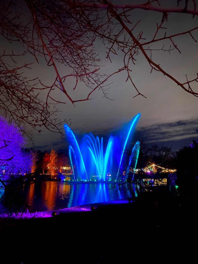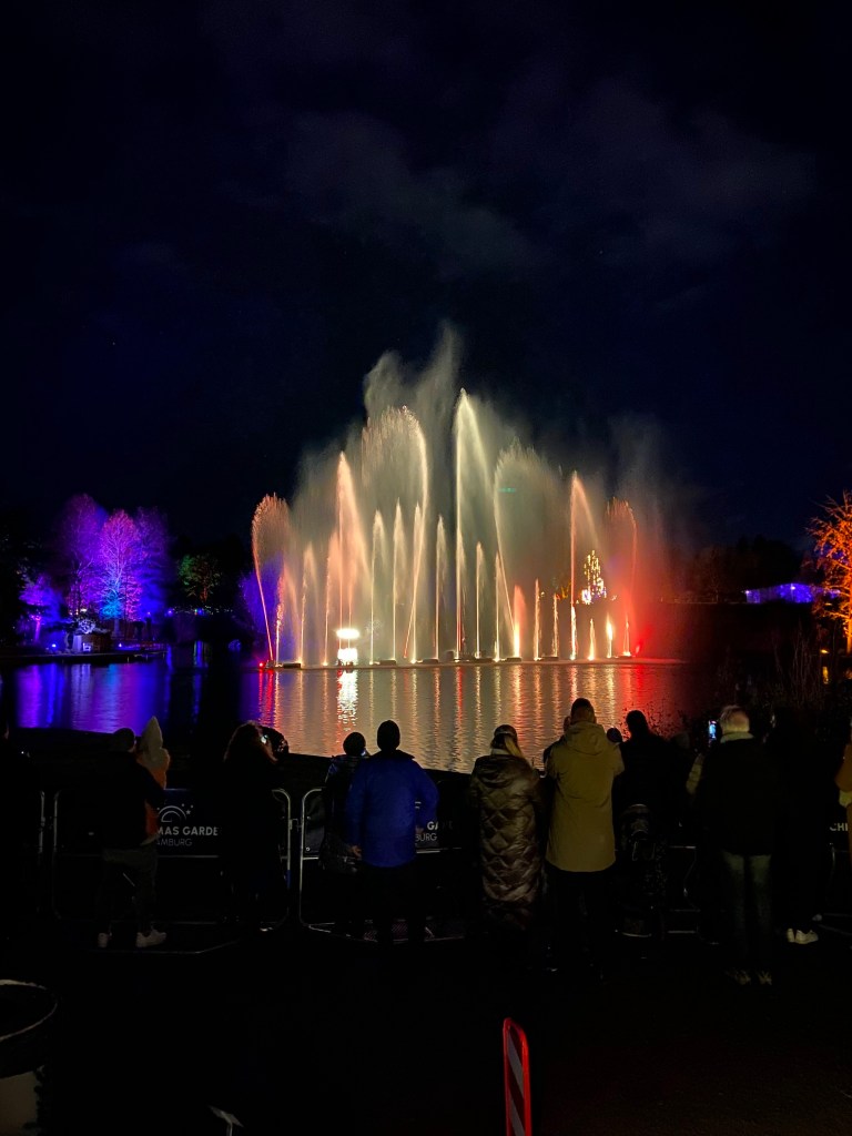 Der liebevoll gestaltete Rundweg führte uns durch eine beeindruckende Vielfalt an Lichtinstallationen. Manche Szenerien wirkten wie fein komponierte Naturbilder: sanfte Beleuchtung, ruhige Musik und dezente Farbakzente. Andere Stationen beeindruckten mit großflächigen Projektionen und intensiven Lichteffekten. Besonders eindrucksvoll waren die Wasserfontänen im Teich, die im Takt der Musik aufstiegen und durch farbige Strahler eine fast magische Atmosphäre erzeugten. Die Spiegelungen auf der Wasseroberfläche verstärkten den Effekt zusätzlich und machten diesen Abschnitt zu einem der visuellen Höhepunkte des Abends.
