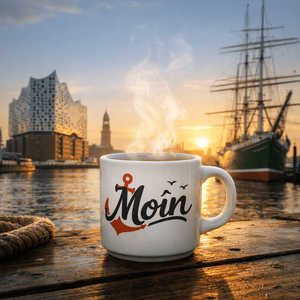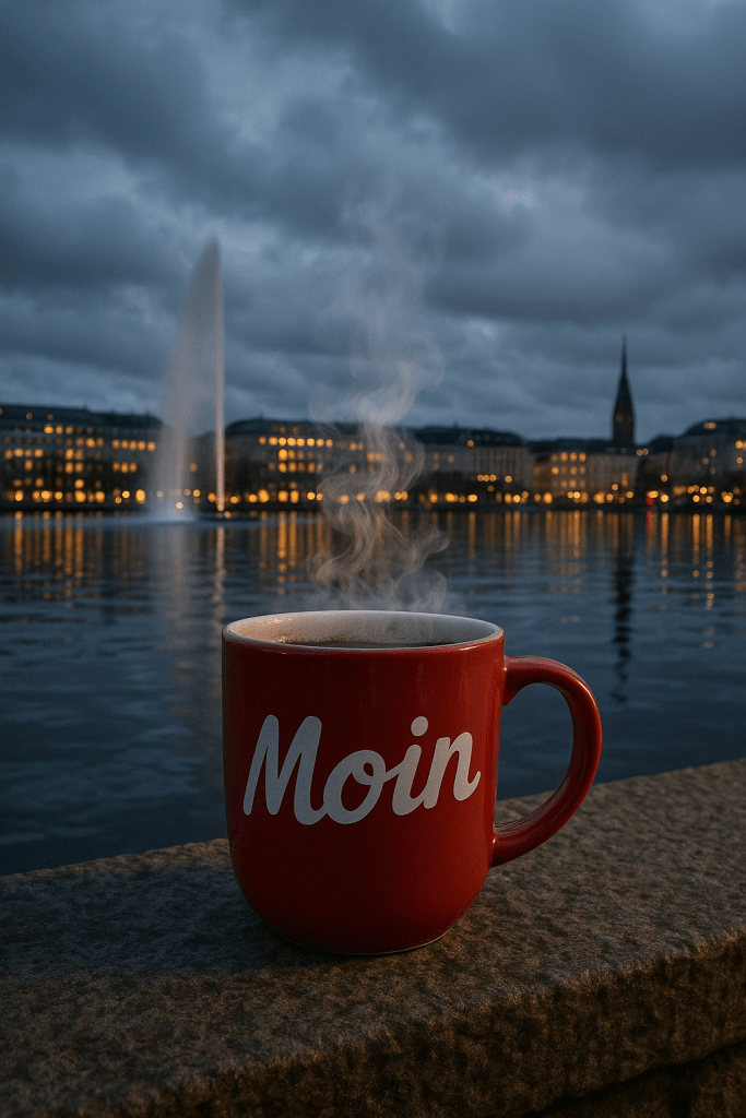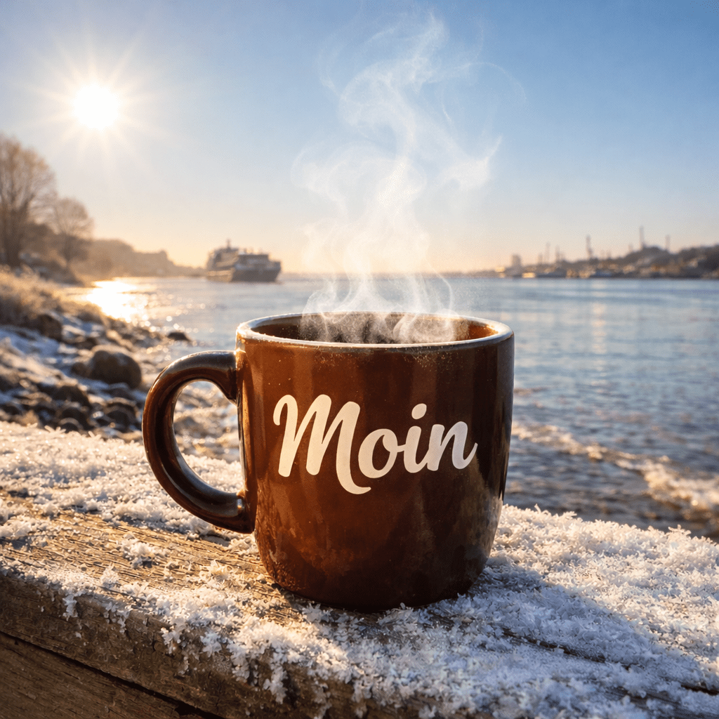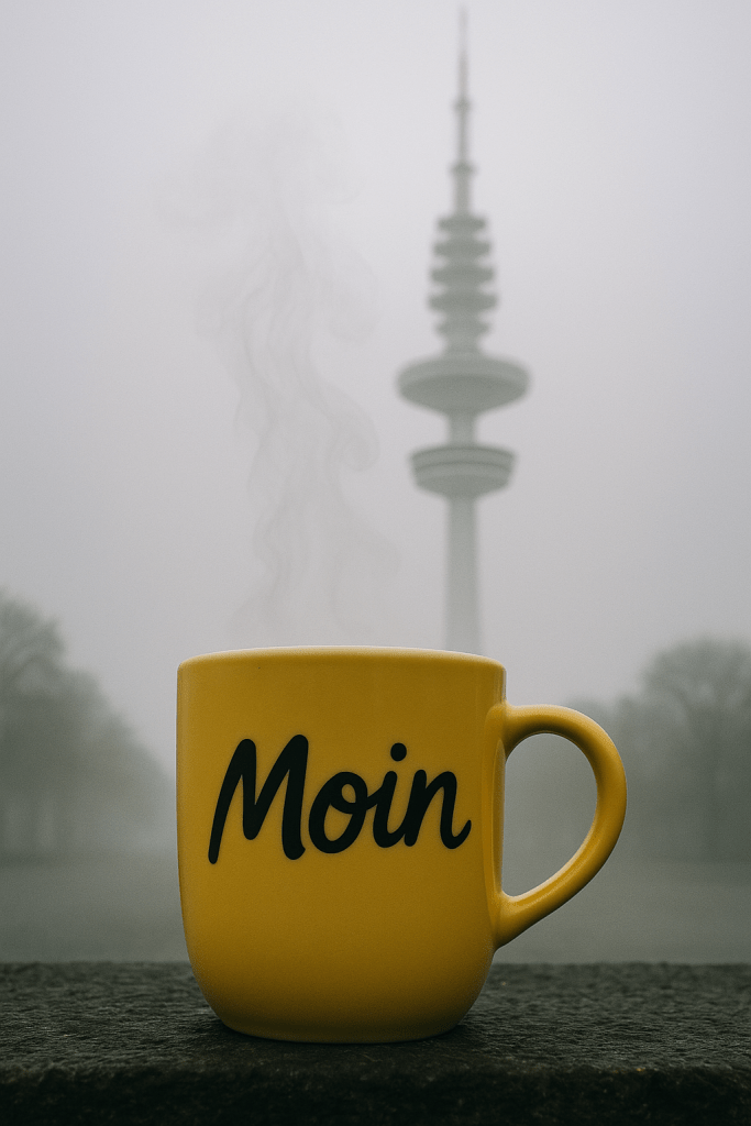 Umso wichtiger ist das morgendliche „Moin“ geblieben. Früh hat sich der Gruß mit der Kaffeetasse am Morgen verbunden – als Symbol für Ankommen, Ruhe und einen klaren Start in den Tag. Dieses Motiv hat sich weiterentwickelt. Heute nutze ich dafür häufig KI zur Bilderstellung. Das ist zeitgemäß und konsequent: vertraute (nicht ganz reale) Motive, modern interpretiert. Ein entscheidender Aspekt dabei ist vielleicht auch die Rechtssicherheit. KI-generierte Bilder ermöglichen es, Stimmungen zu transportieren, ohne fremde Werke zu nutzen oder urheberrechtliche Grauzonen zu betreten. Ich trete niemandem auf die Füße. KI ist für mich ein Werkzeug, kein Ersatz für Haltung oder Persönlichkeit.