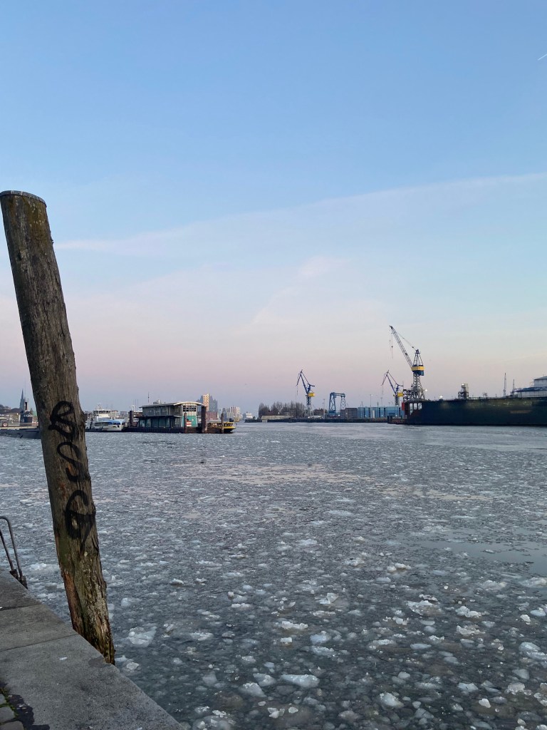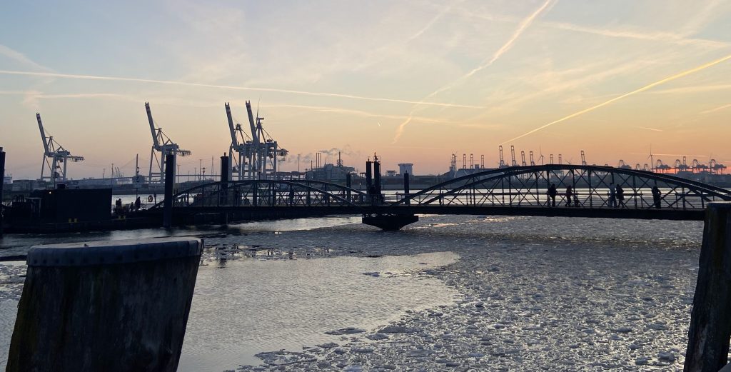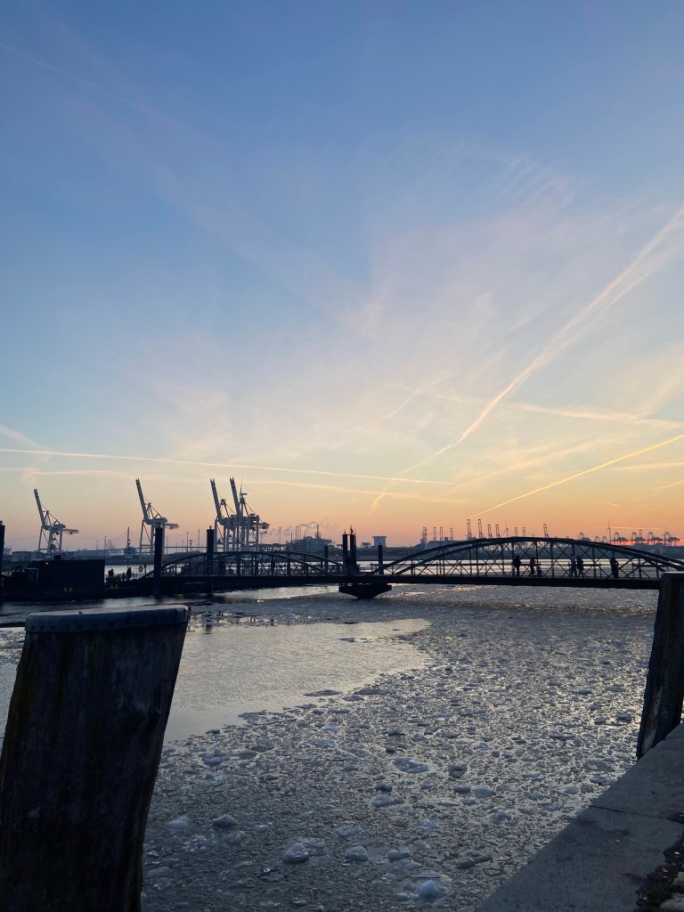 Am frühen Abend des 18. Januar 2026 führte ein gemeinsamer Besuch an den Hamburger Hafen, genauer gesagt an die Fischauktionshalle. Der Winter zeigte sich an diesem Tag von seiner ruhigen Seite: klare, kühle Luft, wenig Wind und ein Himmel, der sich zum Sonnenuntergang hin in warme Orange-, Rot- und Goldtöne färbte. Die tief stehende Sonne spiegelte sich auf der Elbe und ließ die Kaianlagen, Kräne und Backsteinfassaden in einem besonders stimmungsvollen Licht erscheinen.