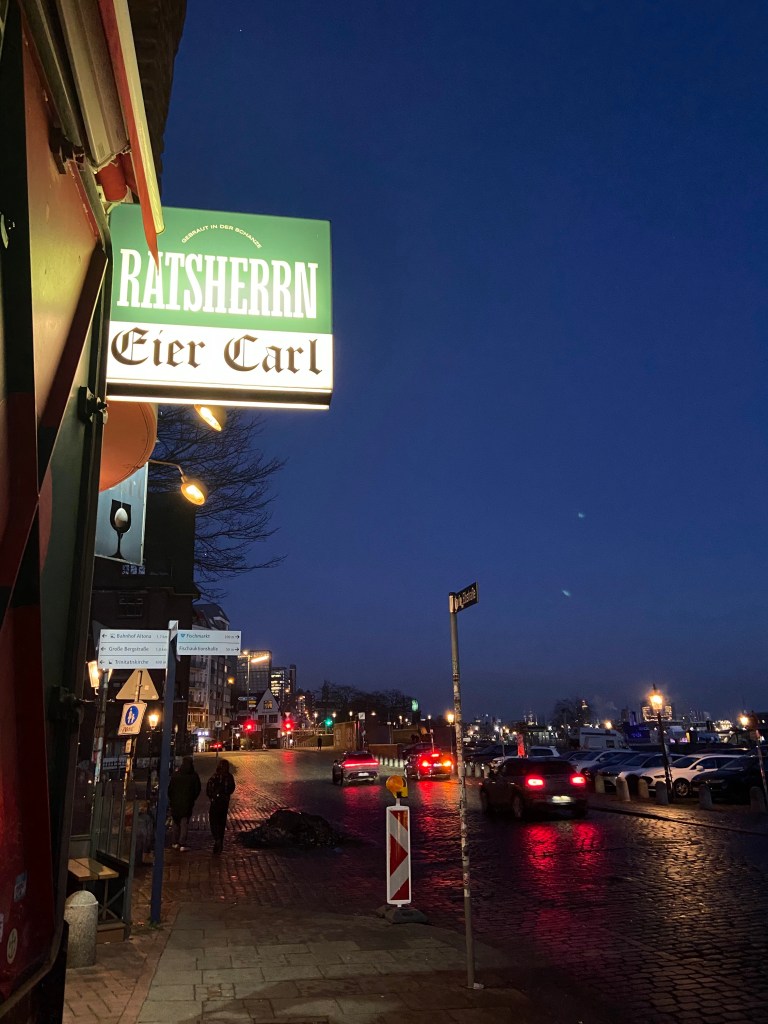 Nach dem Spaziergang am Hafen bot sich eine Einkehr im traditionsreichen Eier Carl an. Das Restaurant ist bekannt für seine bodenständige Küche, seinen unverfälschten Hamburger Charme und eine Atmosphäre, die bewusst auf Authentizität setzt. In der warmen, lebendigen Umgebung ließ sich der Abend angenehm fortsetzen. Klassische Gerichte, freundlicher Service und das typische, leicht urige Ambiente sorgten dafür, dass man sich schnell willkommen fühlte – ein wohltuender Kontrast zur kühlen Abendluft am Hafen.