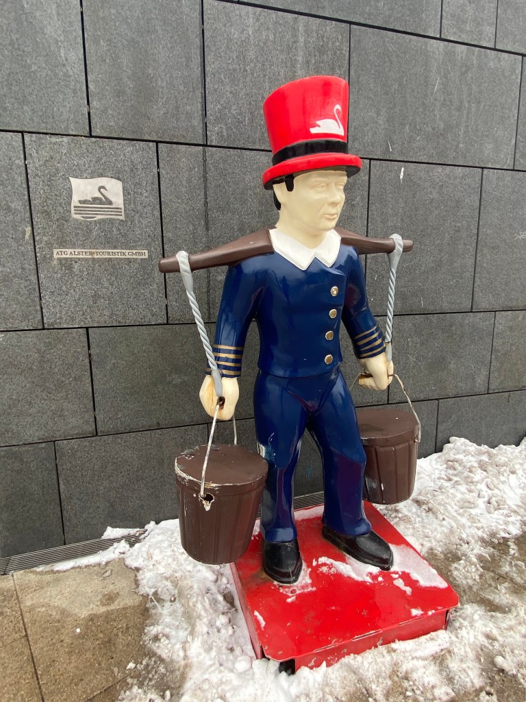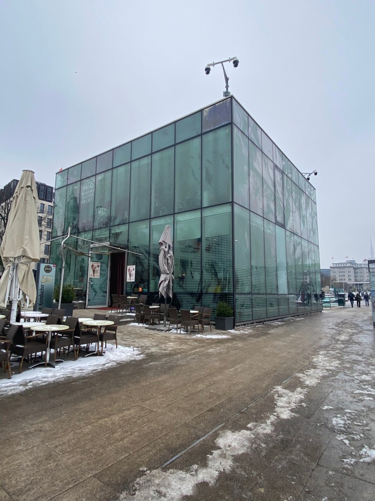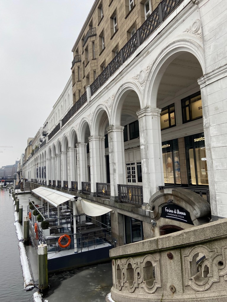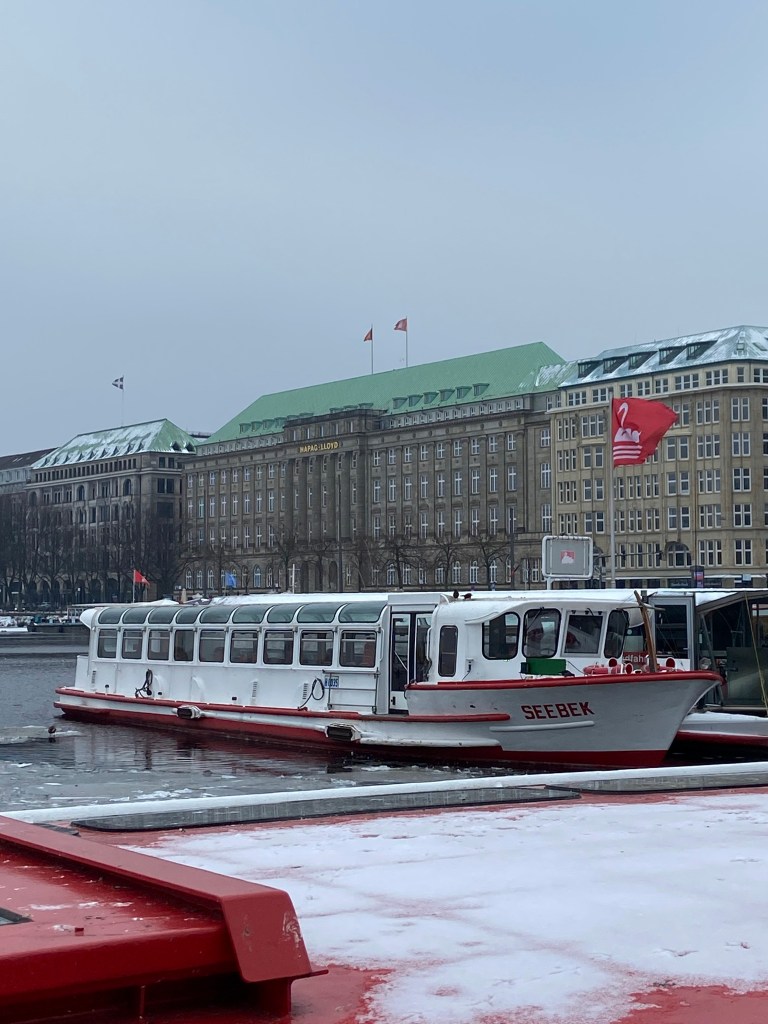 Der Blick nach draußen blieb dennoch präsent. Die Binnenalster lag ungewöhnlich ruhig da. In der Winterzeit ruht die Alsterschifffahrt witterungsbedingt, sodass keine Schiffe die Wasserfläche durchzogen. Diese Pause verlieh der Alster eine beinahe stille, entschleunigte Wirkung. Durch den anhaltenden Dauerfrost hatten sich zudem einige Eisschollen gebildet, die langsam über das Wasser trieben und den Eindruck eines echten Wintertages mitten in der Stadt verstärkten.